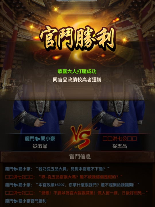 | 1, 不同官品輸贏很明確,若相同官品(通常是被某人踢,想知道自己在衝高一下政績能不能報仇踢回去),可以到「排行榜」看一下對方的政績有多少。 |