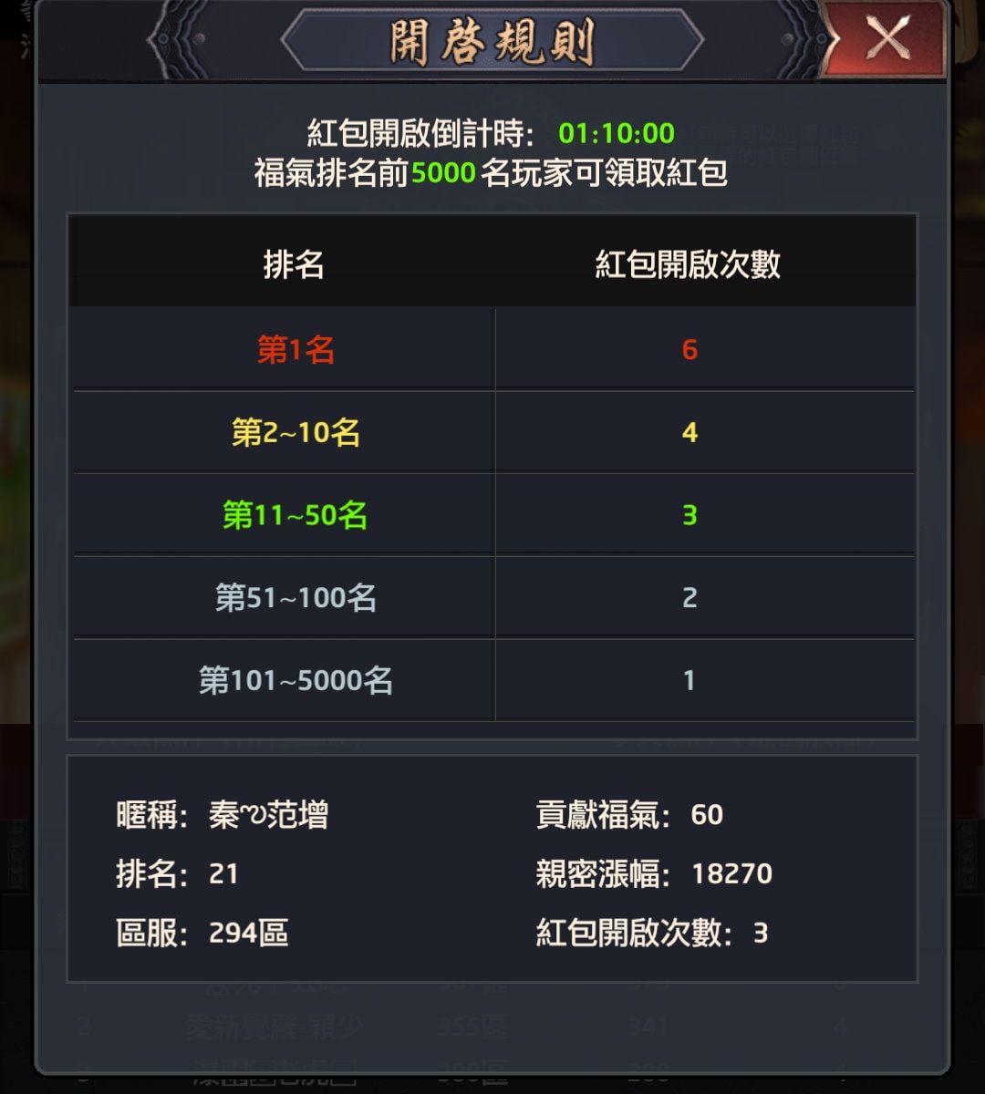 此活動共有50服參與,玩家資質每漲幅40點/親密每漲幅300點,福氣+1。所有玩家貢獻的福氣加總後的數值,決定紅包等級。點「更多獎勵」可看見紅包1~30級的獎勵內容。