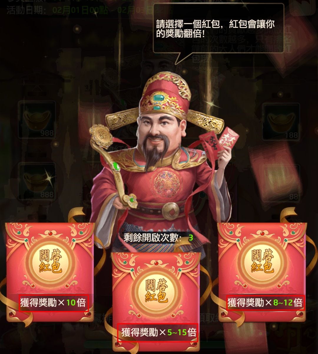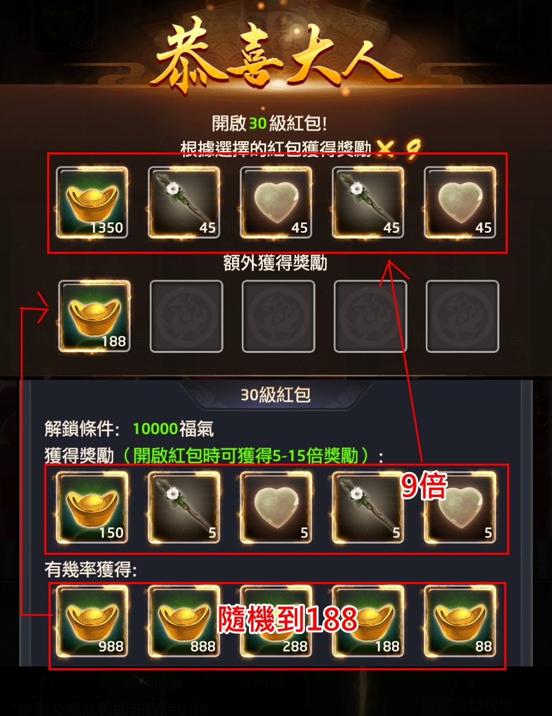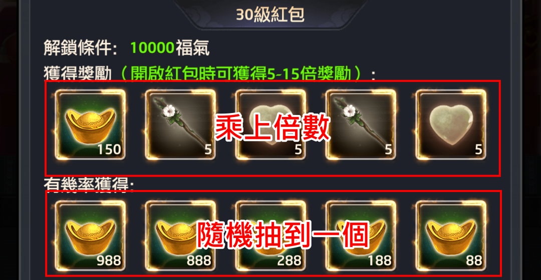 附註:紅包的上層獎勵是會乘上倍數的,下層獎勵則是隨機抽到一個。