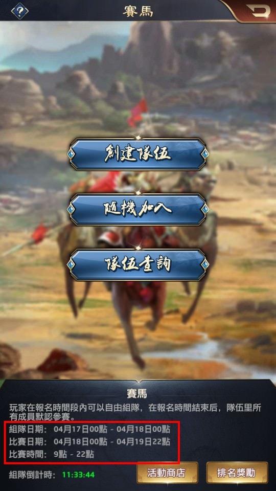 賽馬界面,第1天是組隊,第2天才開始跑,有時跑1天,有時跑2天,要注意一下天數喔!可以跑賽馬的時間為早上9點至晚上22點。