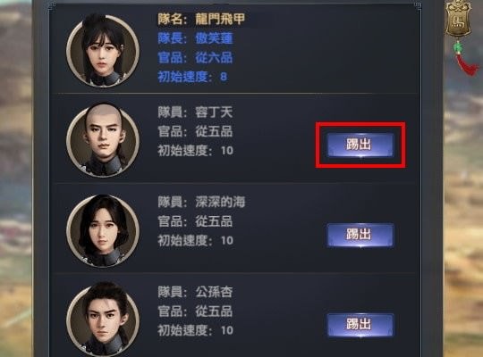 隊長可以加人也可以踢人,如果對方加入後才知道要花元寶,不想參加了,就可以從這邊把他「踢出」。