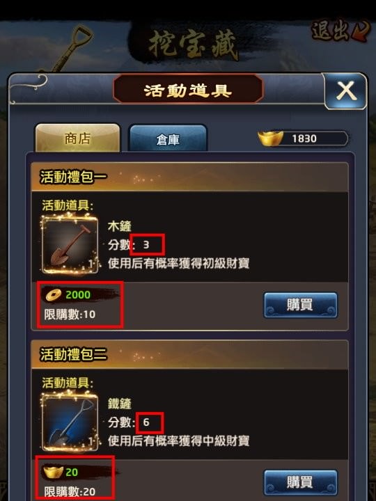 我再用「挖寶藏」來對照,同樣是「只花元寶」(不充值)玩法,木鏟(2000金幣 x 10)+ 鐵鏟(20元寶 x 20),一天可拿 150 積分(3 x 10 + 6 x 20),翰林令牌要 1,000 積分,那至少要7天活動(每次活動2~4天不等),花 14萬金幣+2,640元寶才能換到翰林令牌,你看看報酬率差多少。