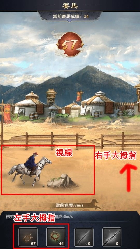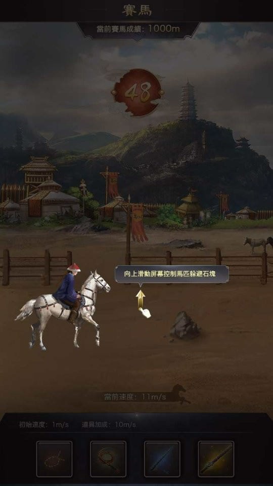 一開始會有教學,賽馬的規則很簡單,就是用鞭子讓馬加速,同時遇到石頭要跳躍而已。