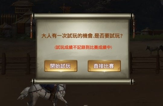 介紹完畢後會有一次的練習機會,第一次玩賽馬的人最好還是練習過,點「開始試玩」,但若已是老手就可以點「直接比賽」。