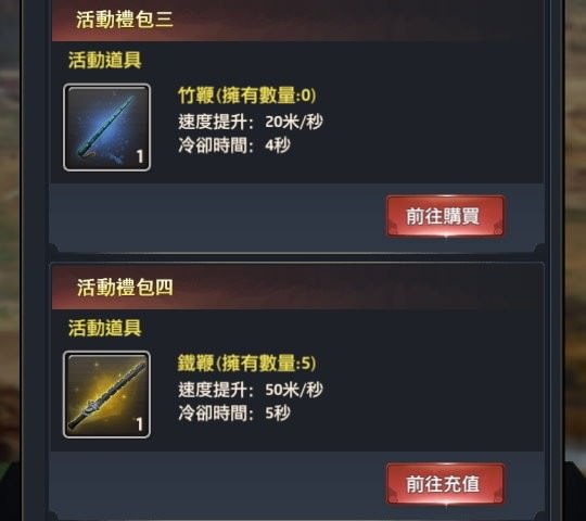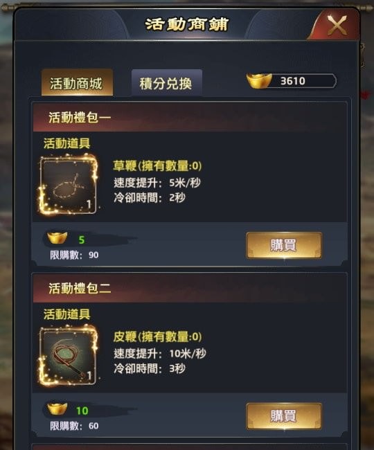 正式比賽前,要先到活動商鋪買鞭子,用元寶能購買的有2種: