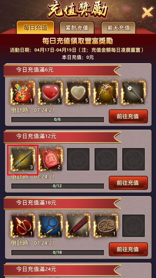 每日充值、累計充值、累天充值,這邊會送竹鞭跟鐵鞭。