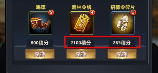不過要注意到積分兌換會越換越貴喔!像換第一個翰林令牌是 2,000 積分,第二個則要 2,100 積分,換第一個招募令碎片是 250 積分,第二個則要 263 積分,這遊戲很多兌換都是這種換越多越貴的狀況。