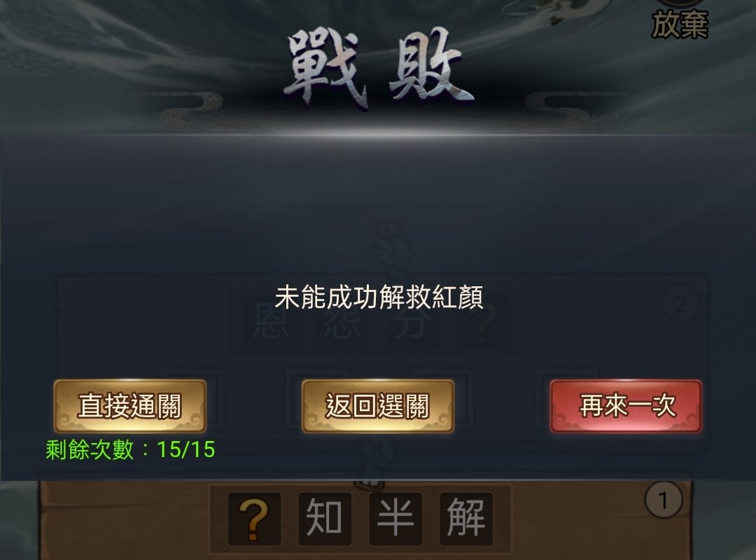 若闖關失敗則會出現三個選項:直接通關(15次)、返回關卡(放棄)、再來一次(可無限次重來)。