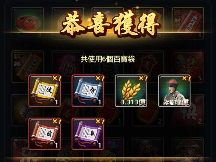 若是要開百寶袋,我會一次開6個,原因是開6個(含以上)時就有極高的機率開出武力(智力、政治、魅力)強化卷軸;而開5個(含以下)時,機率似乎明顯低很多,所以我都是6個、6個、6個這樣開。