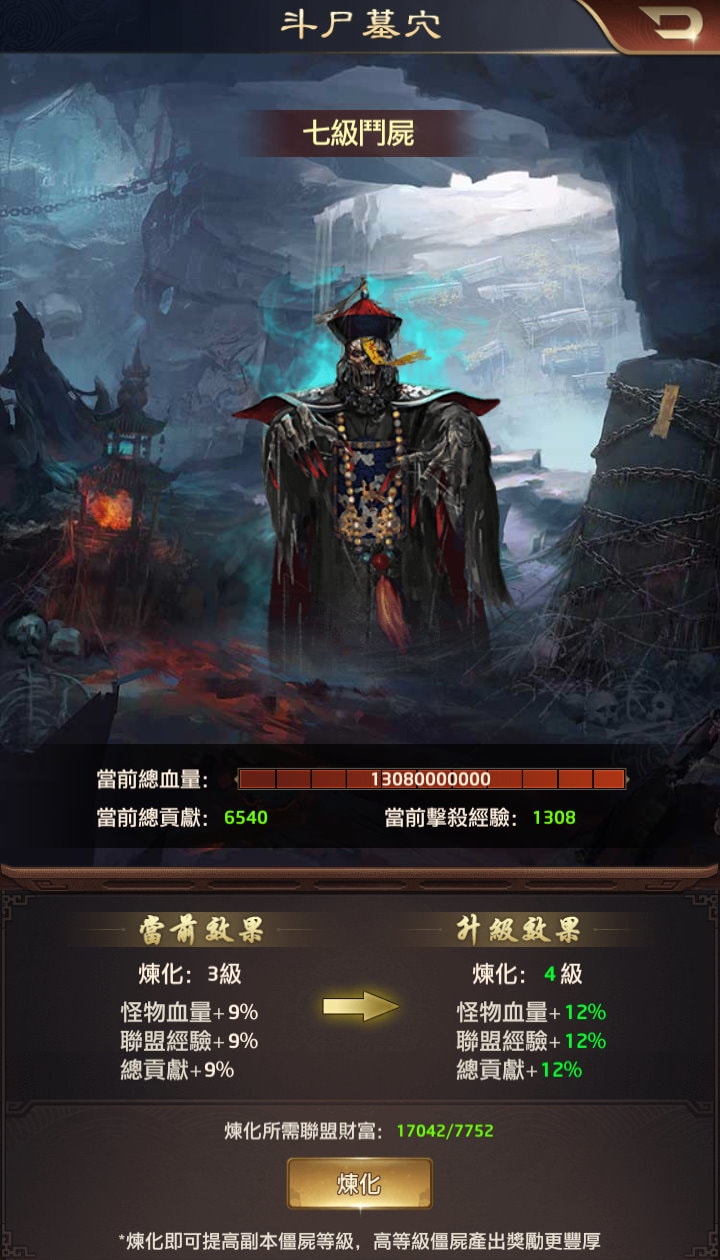 花費「聯盟財富」即可煉化殭屍,每次煉化都會+3%血量、+3%聯盟經驗(擊殺後添加「聯盟經驗」的數值)。