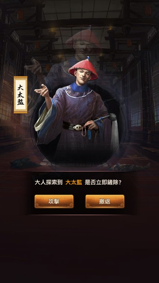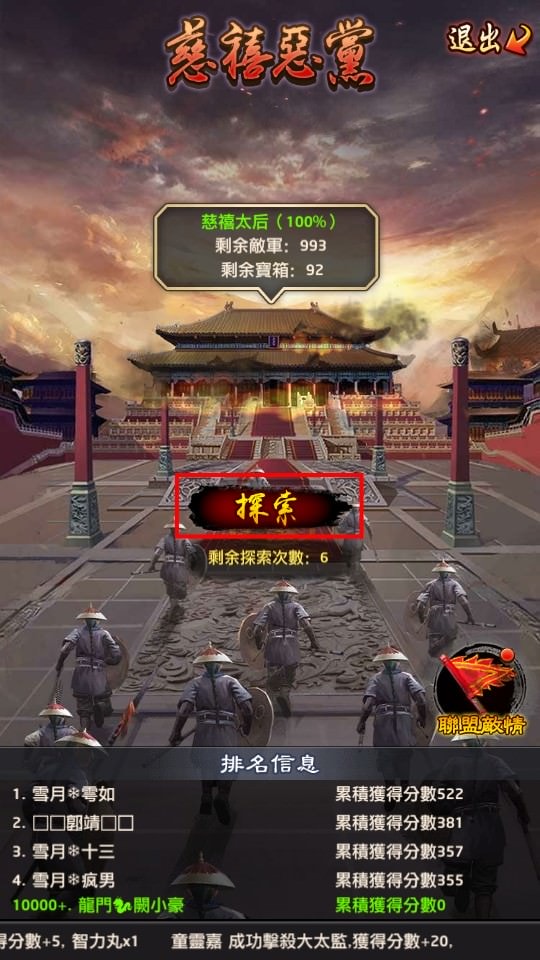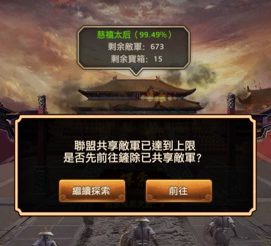 點「進入戰場」後的畫面,這邊會有3個資訊:慈禧太后剩餘血量、剩餘敵軍、剩餘寶箱,要先「探索」。