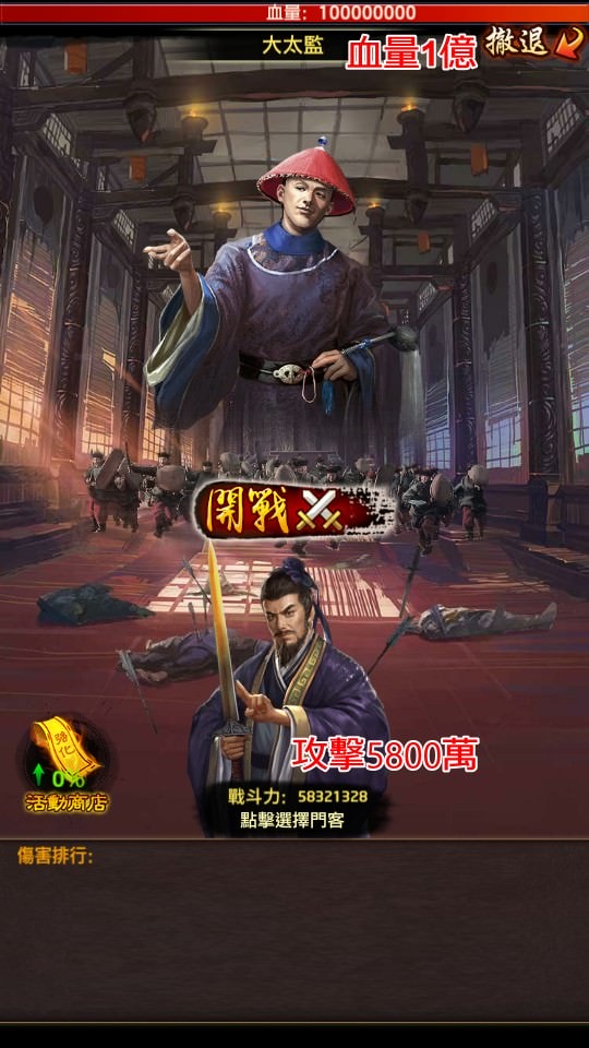 譬如我只是遇到大太監而已,他的血量就有1億,我最強的門客攻擊才 5,800 萬。很多玩家第一次玩不知道,不管遇到誰就把所有門客派出去戰鬥,用光所有門客才打死1隻怪,甚至可能打不死,根本賺不到多少活動積分。