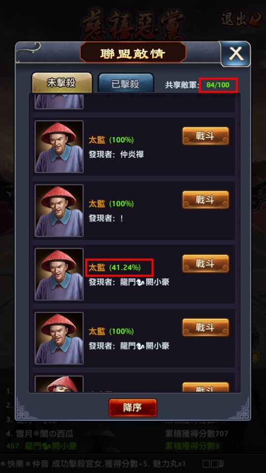 「聯盟敵情」這邊會秀出所有你同聯盟的盟友所遇到的敵人,這個有點類似倉庫的概念,盟友遇到敵人選擇撤退的,都會出現在這,同盟的每個人都可以去打。這邊會有很多被打到一半,血量剩沒多少的敵人,從這邊優先挑血量少的來打。