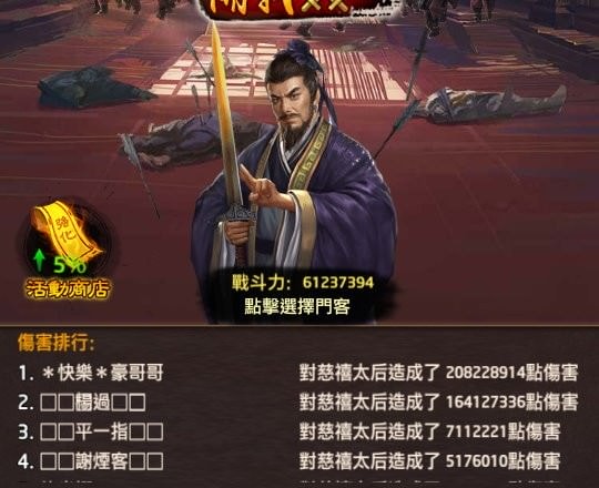 那活動結束前,沒派上場的門客怎麼辦?我個人是會全部派去打血量最高的怪,譬如慈禧太后,若盟內沒慈禧,就派去打大內總管,這樣一來也不容易被撿走尾刀。