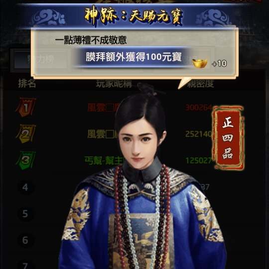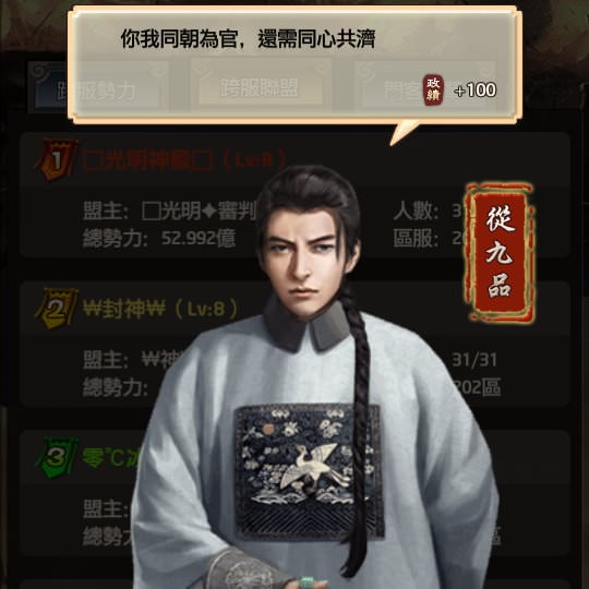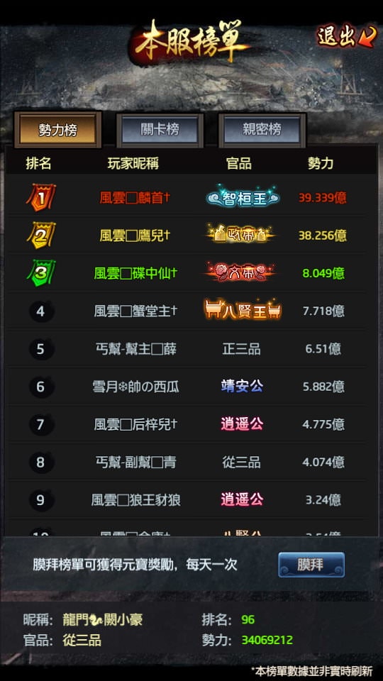 | 勢力榜:玩家總勢力(門客+子嗣/聯姻的勢力總和) |