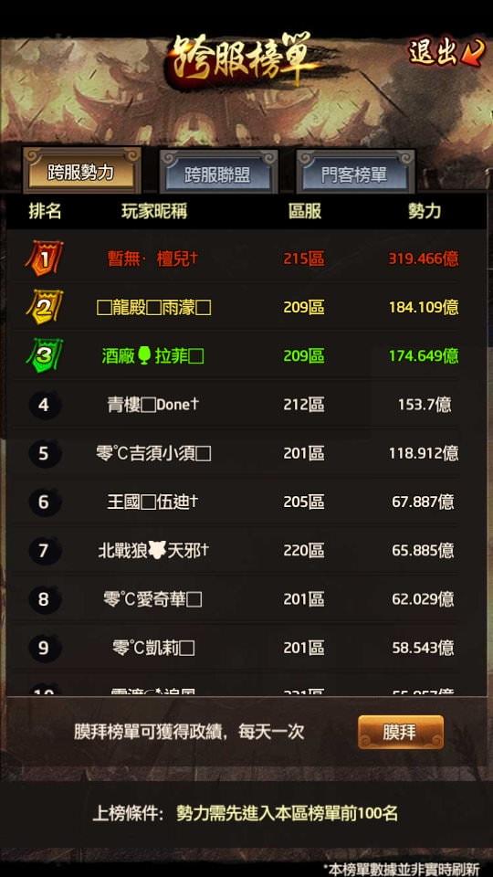 跨服榜單是以100服為單位,1~100服、101~200服、201~300服各自有自己的榜單。(京城則是以25服為競爭單位)