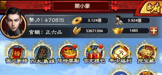 | 系統 | 官品 | 勢力 | 成就 | 道具 | 每日任務 | 主線任務 | 七日福利 | 一鍵功能 | 重歸仕途 | 版本更新 |