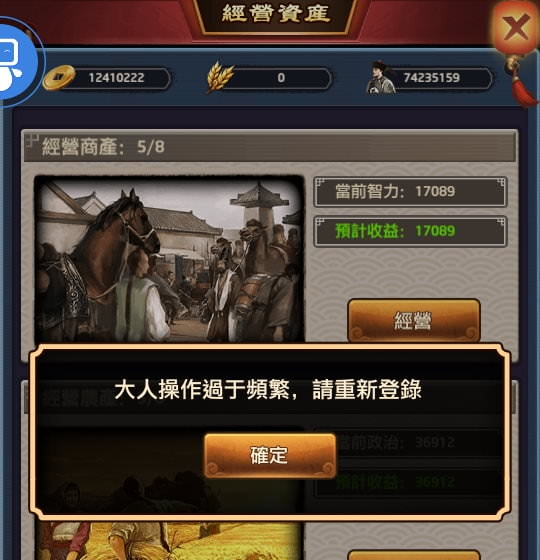 等發現所有門客都上場還是打不死關卡Boss,就得再把武力門客升級,此時智力會破萬,開始變成2分鐘收成1次,但沒關係,就是繼續「壓2分鐘智」,通常最多就是「壓3分鐘智」,再多效益就不好了。