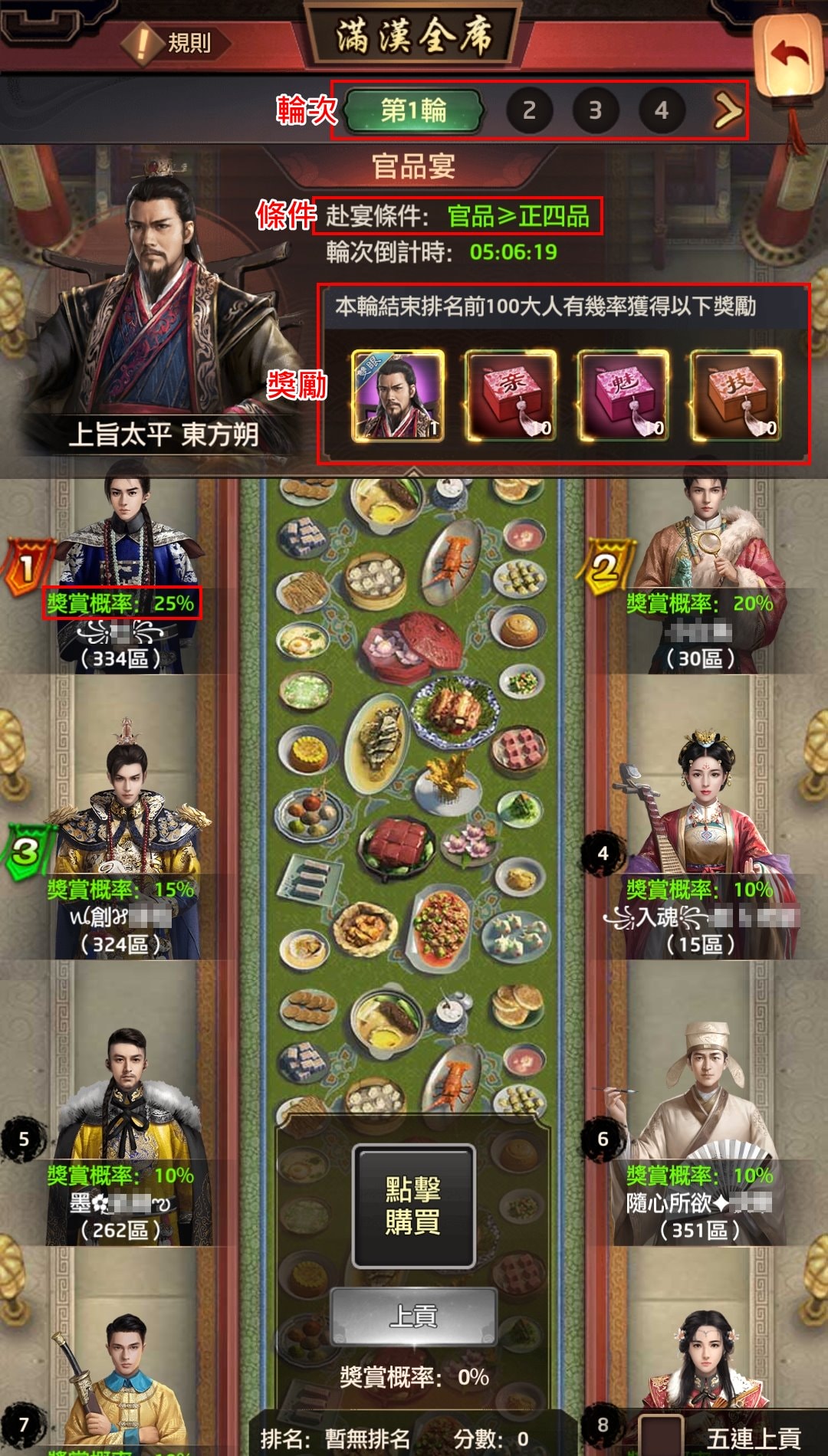 - 大人滿足多輪次宴會的赴宴條件,均可參與上貢。