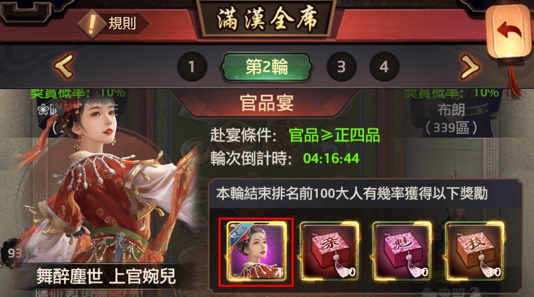 - 宴會結束後排名靠前的大人將有概率獲得聖上的獎賞,排名越靠前概率越高。