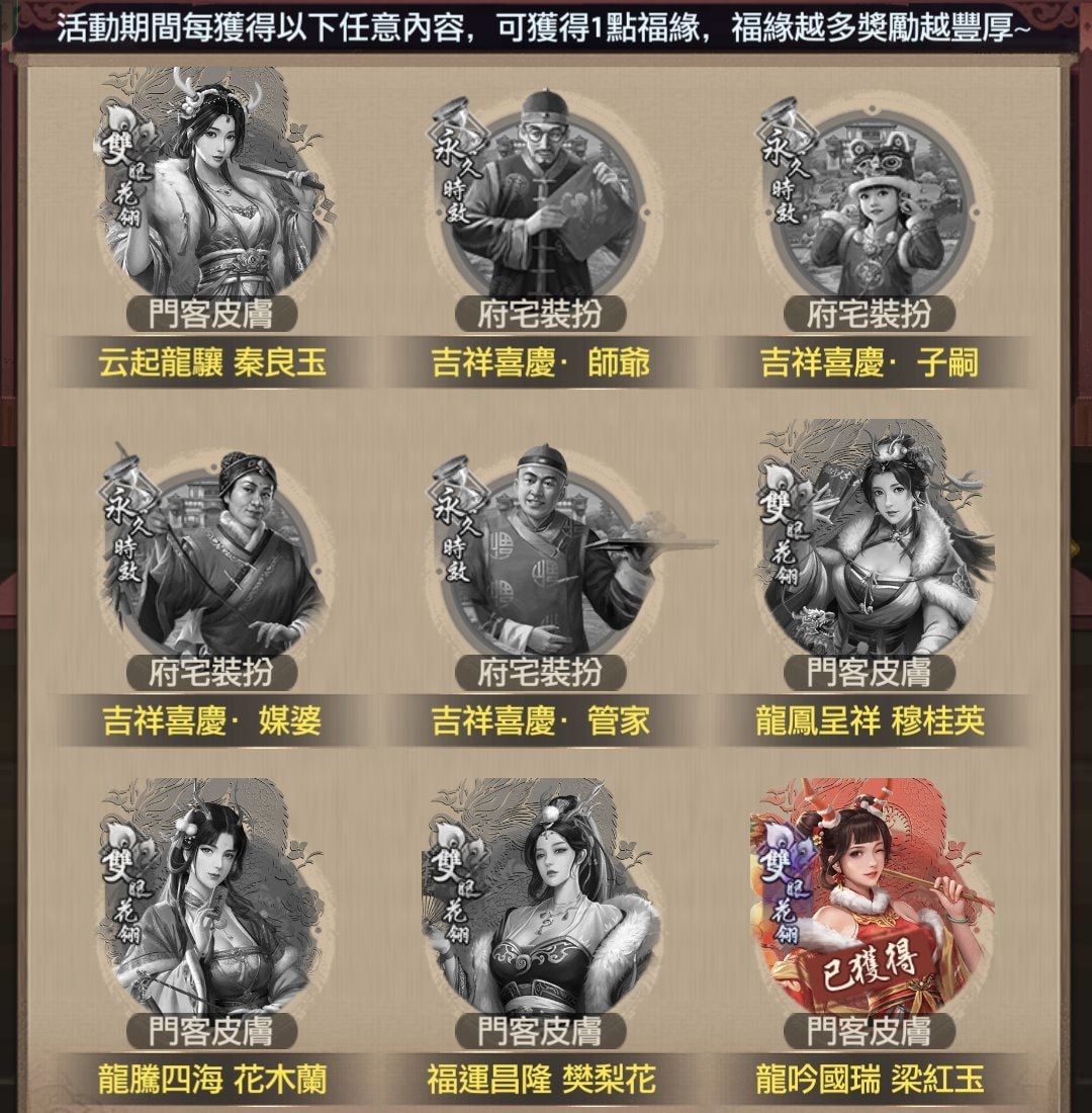 簡單來說這活動要收集9種物品,每獲得1個就能讓福緣+1,其中有5個門客皮膚與4個府邸裝扮,基本上只有1個不必儲值,其餘8個都得靠儲值取得。