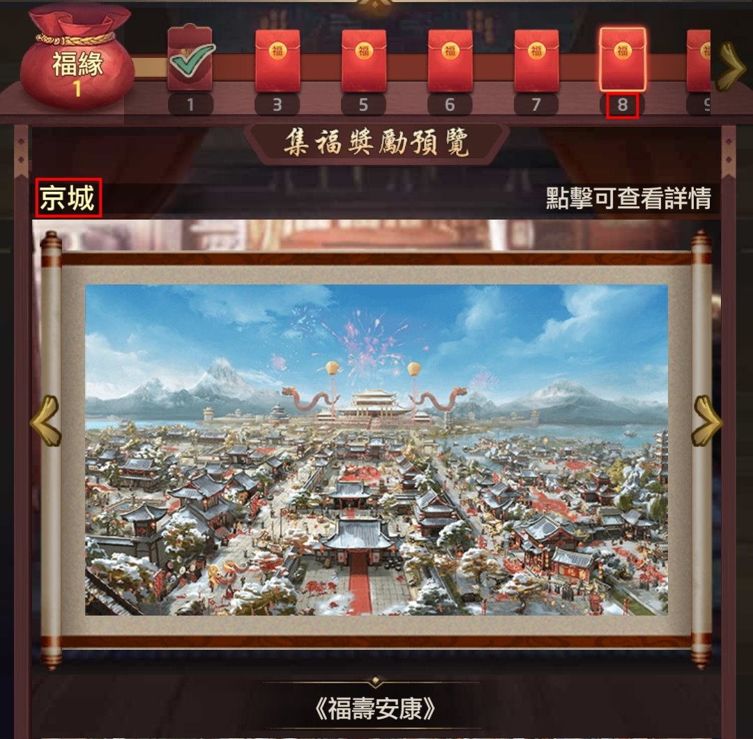 當中比較特別的大概是,以往只有「府邸」能裝扮,現在連「京城」(出府)也有。而目前京城只有兩種裝扮,一個是「VIP等級」達V21時(至少 CNY 10,000,000)贈送的,一個就是這活動湊到8福緣後能取得的《福壽安康》。