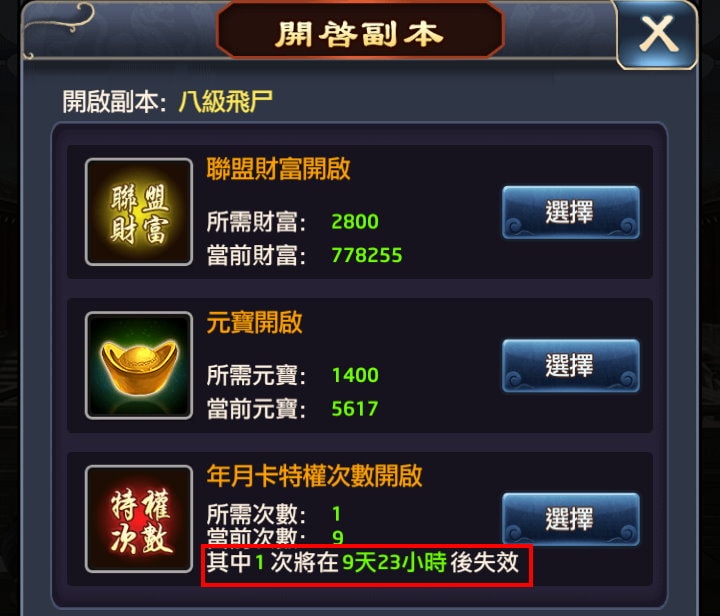 另外根據遊戲的說明,若我在2月1日買了月卡+年卡,會顯示剩33次特權次數,開聯盟副本殭屍時,會優先扣除有效期限「日期較近」的次數,此時年卡還有一年期限,月卡只有一個月的期限,就會先扣月卡的次數。