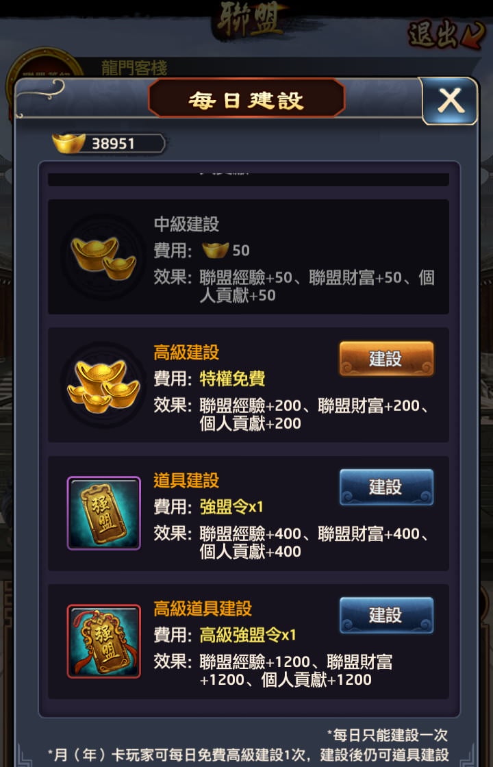 購買月卡或年卡,在聯盟建設時,享有免費每日「高級建設」1次(無法選低建、中建)。