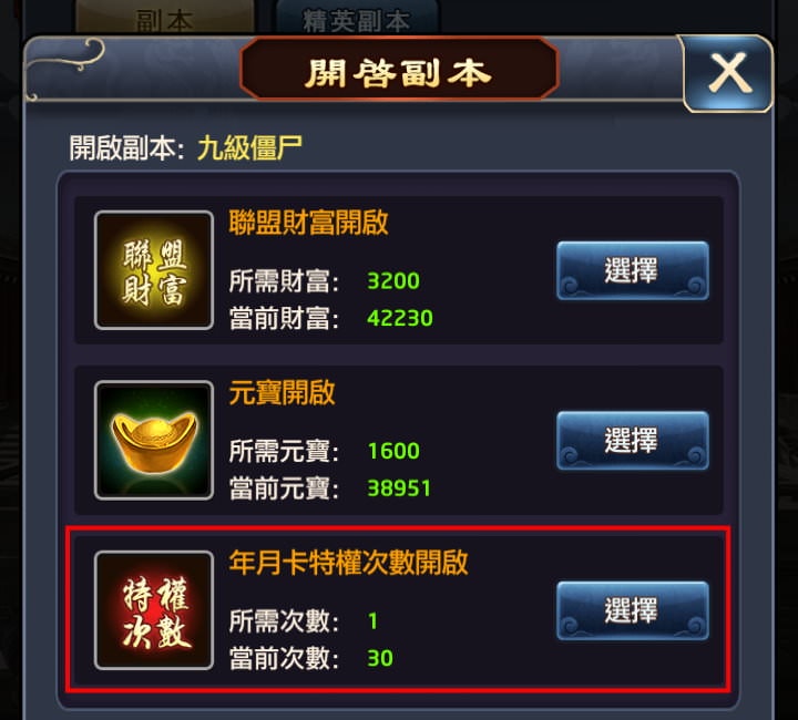 購買月卡可以增加3次、購買年卡可以增加30次的「副本特權開啟次數」,可以用來開啟任何等級的殭屍副本,所以用來開啟越高級的越有價值。