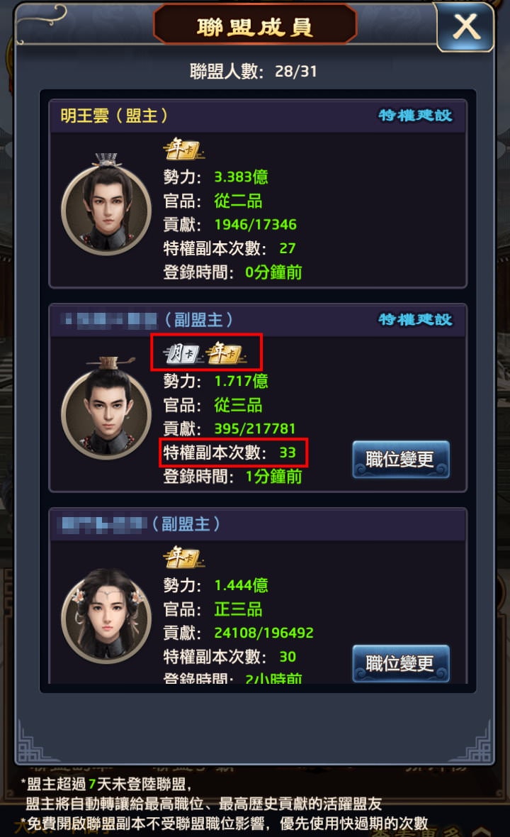 聯盟成員界面這邊,會秀出哪些成員有購買年卡、月卡,還剩下多少「特權副本次數」,可以安排年卡/月卡快過期的盟友優先幫忙開副本。