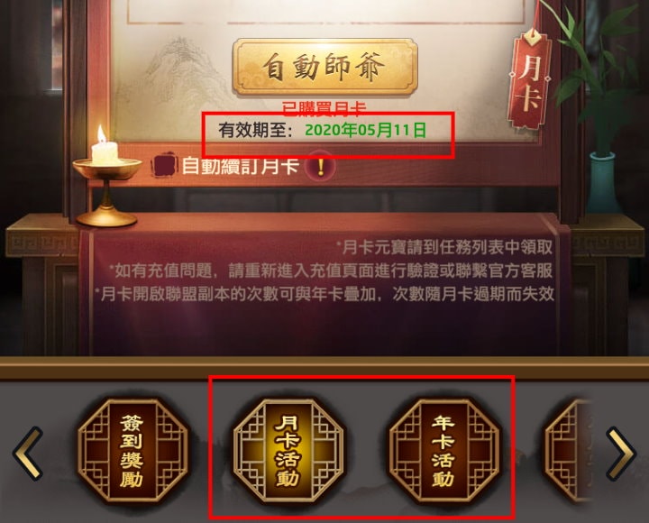 點右下角「福利」,再點「月卡活動」或「年卡活動」,就可以看到有限期限到什麼時候。假設你是同時購買月卡+年卡的話,前3次使用會算在較快到期的月卡上。盟主知道成員年月卡的到期時間,才能安排成員負責哪時候使用副本次數開殭屍。