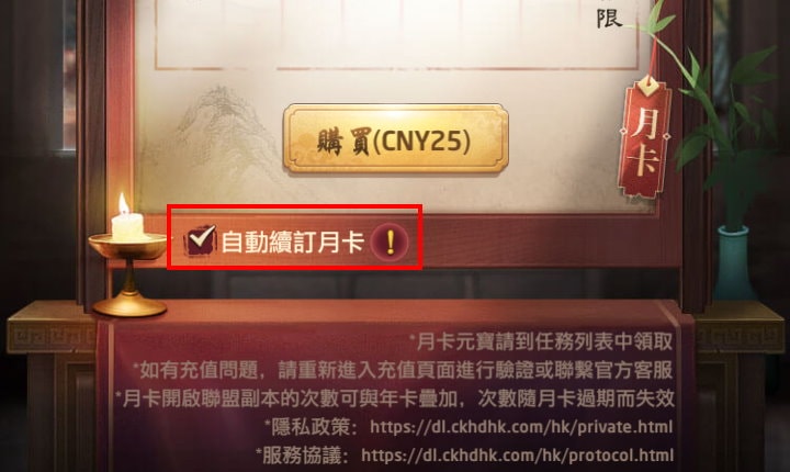 自動續訂月卡會有優惠,原本30人民幣(台幣140元)變成25人民幣(台幣130元)。
