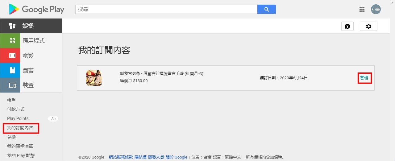 當不玩遊戲後,或是不想繼續購買月卡,安卓系統(Android)是到 Google Paly 點「我的訂閱內容」,選官老爺,點「管理」。