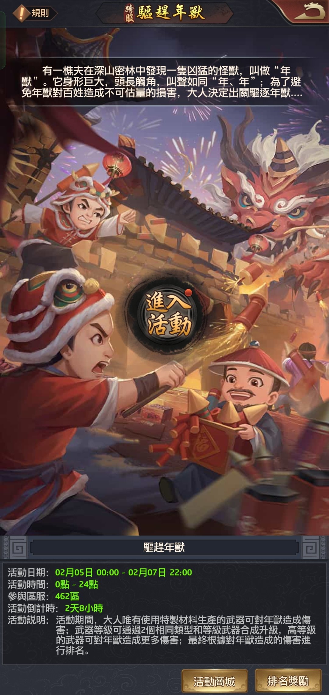- 跨服個人活動,滿足活動入場限制資格的大人可參與驅逐年獸,保衛家園。