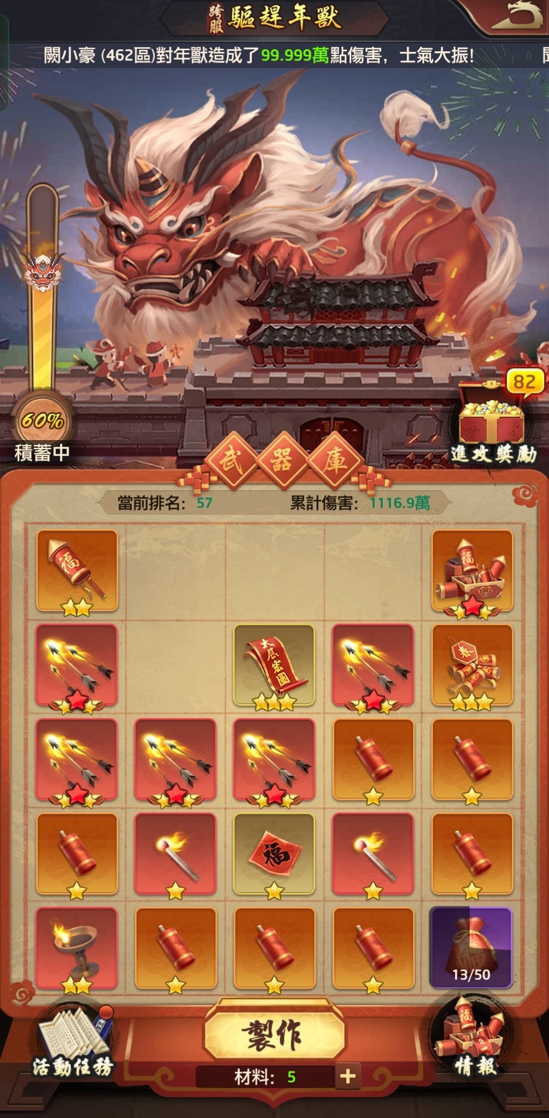 - 年獸入關迫在眉睫,大人可消耗1點材料可隨機製作1種可對年獸造成傷害的武器。