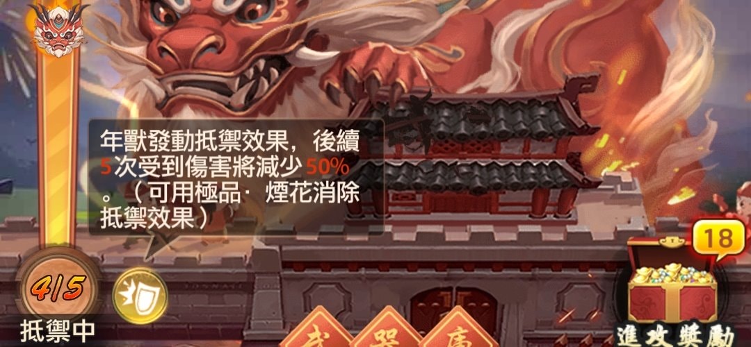 當「積蓄中」達100%後,年獸會發動「抵禦」,接下來5個回合的傷害會減少50%。