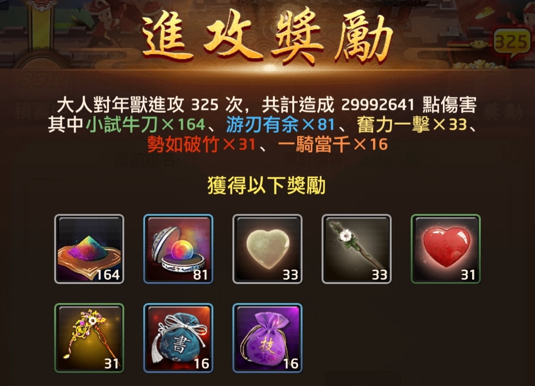 - 活動期間對年獸造成的總傷害越高,排明越高,獎勵也越豐厚。