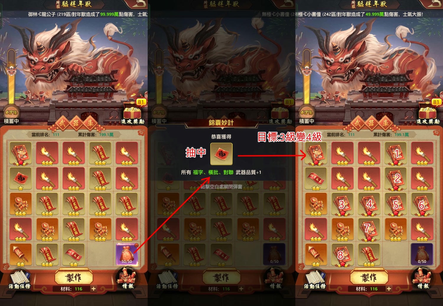 - 合成1個「年畫」+合成1個「火箭」,這兩個動作要連續進行(若中間有合成動作就無法達成99.9萬傷害),接著用「年畫」丟年獸,立刻再用「火箭」丟年獸。