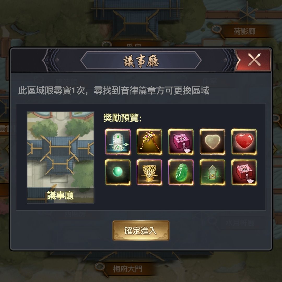 ④獲得【音律篇章】,及通關該區域,可以再次選擇區域。 - 集齊所有區域的【音律篇章】方可進入藏寶閣,藏寶閣通關後,可重置探索區再次尋寶。