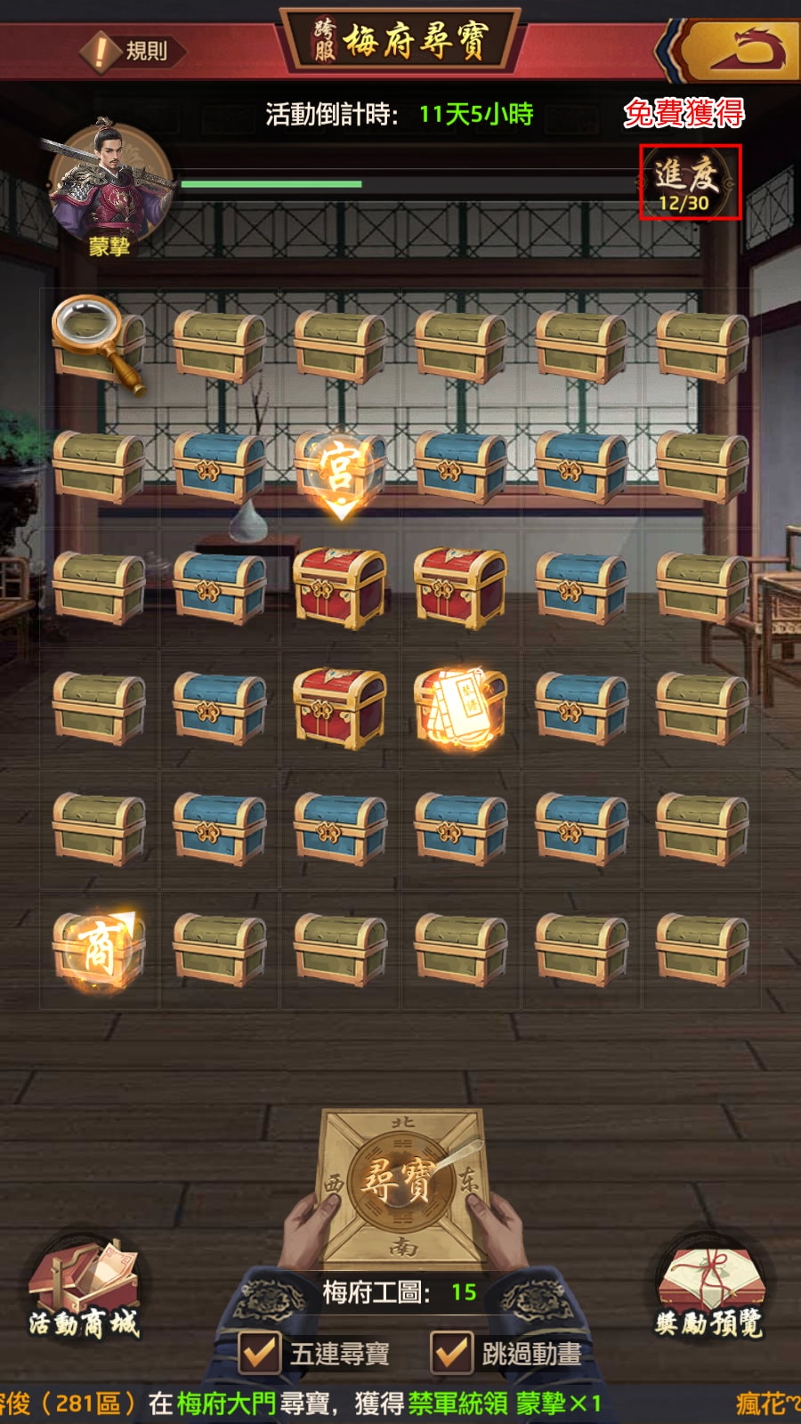 累計尋寶30次,就能獲得「蒙摯喬裝令」,會放在道具中,會有段過場劇情,此外招募介面「瑯琊才子」中的「謀士.蒙摯」也會解鎖。