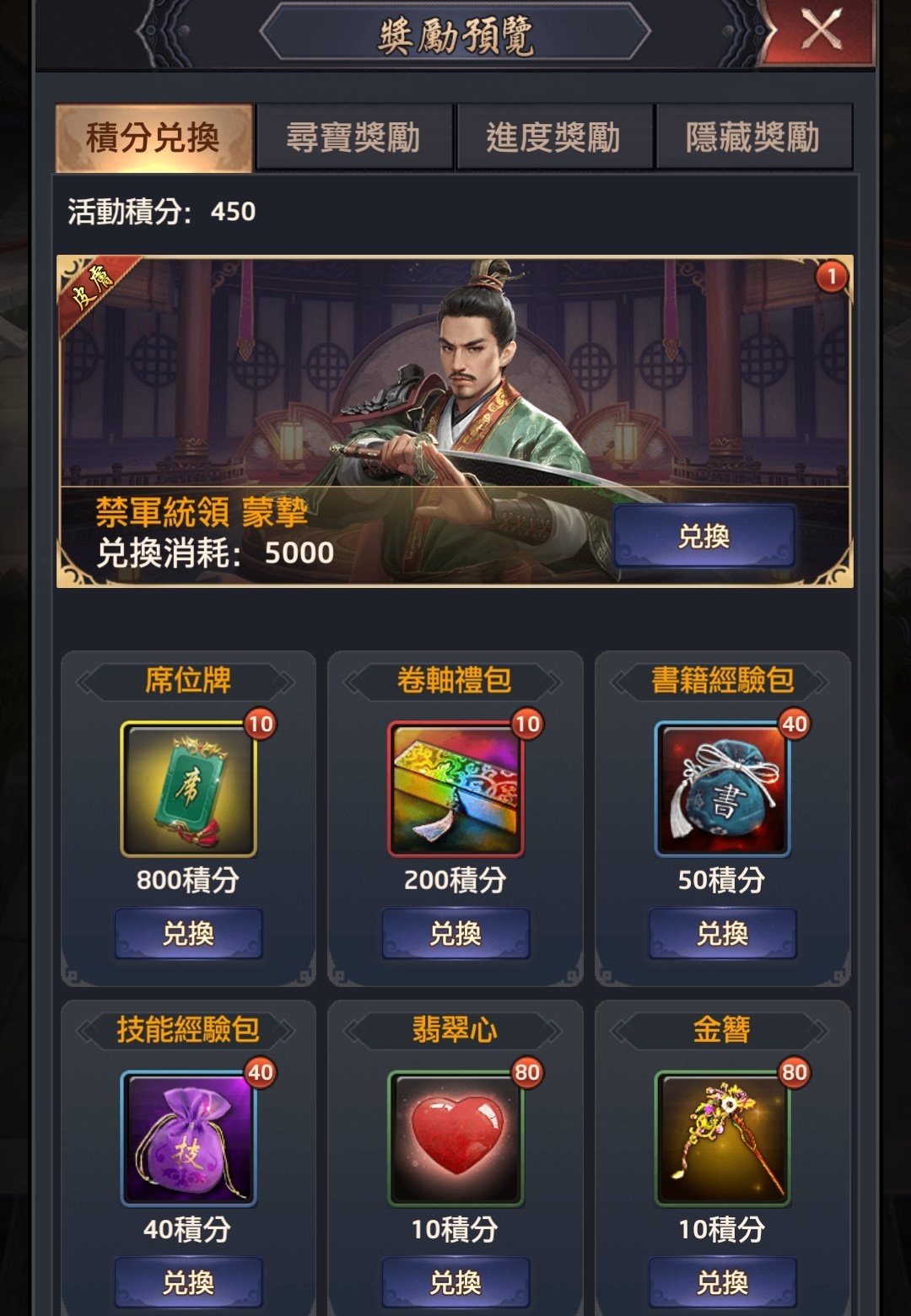 在這活動中積分的用途反而大於小道具,若想透過「活動兌換」取得「蒙摯武力皮膚」或「席位牌」的,也只能多取得「梅府工圖」了。