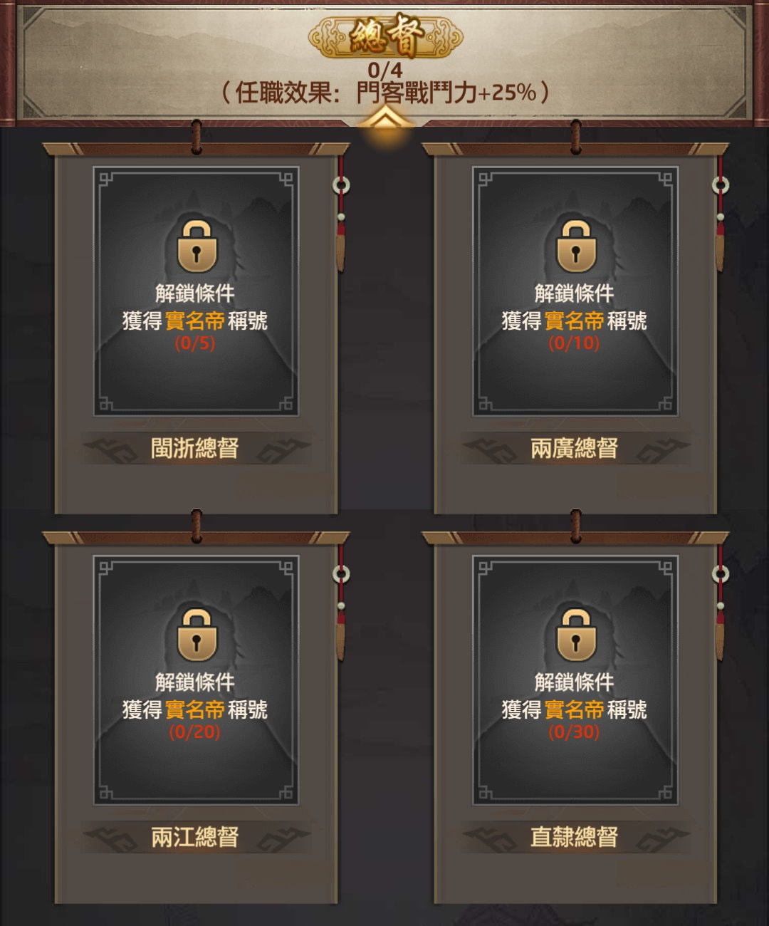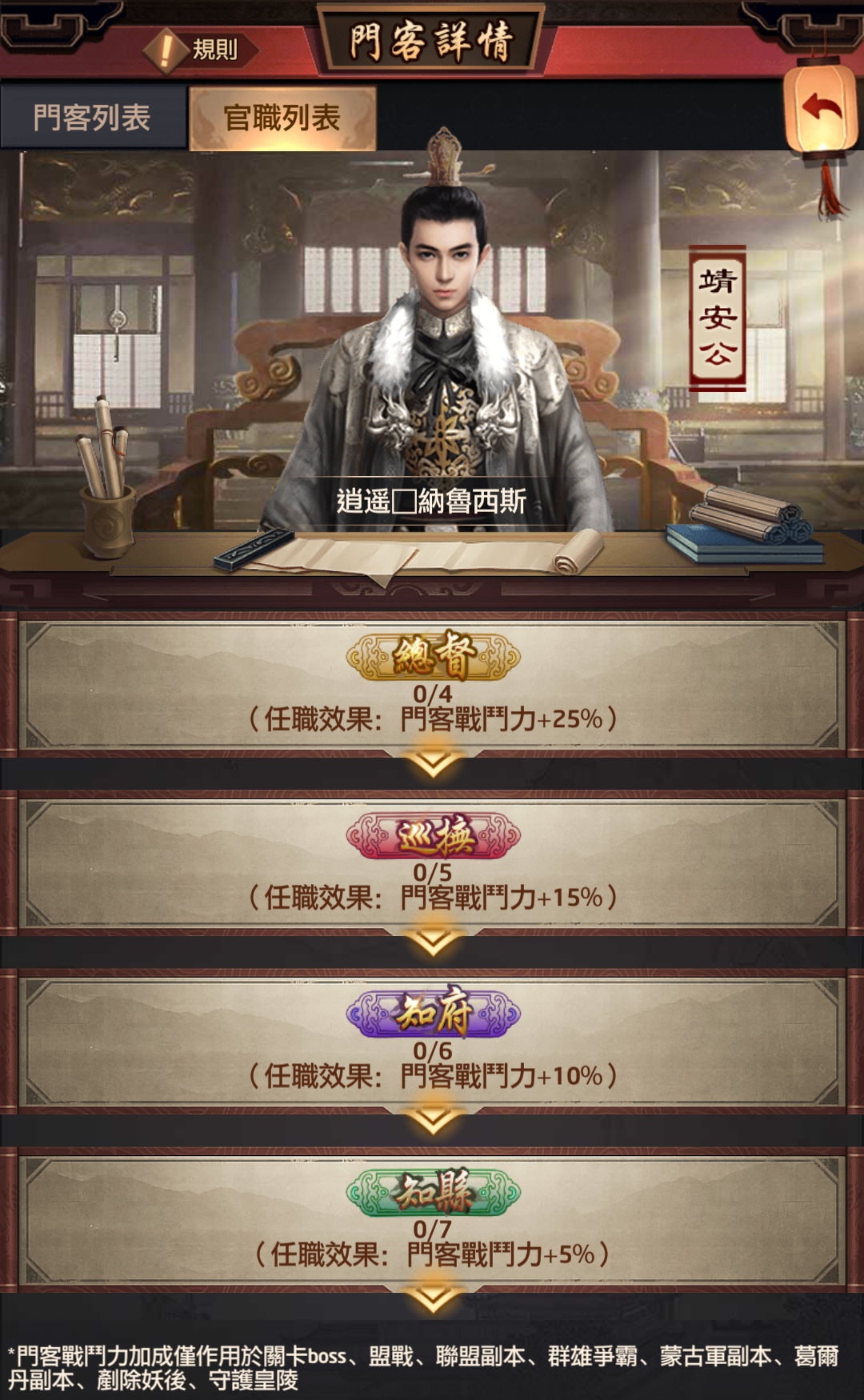 | 職稱 | 任命數量 | 門客戰鬥力 | 稱號需求 | 職稱(稱號數量) |