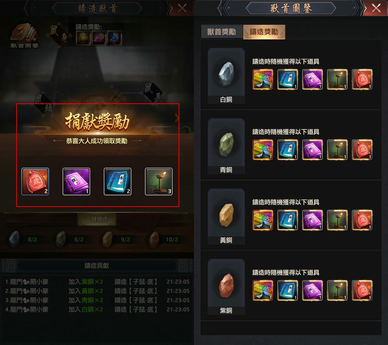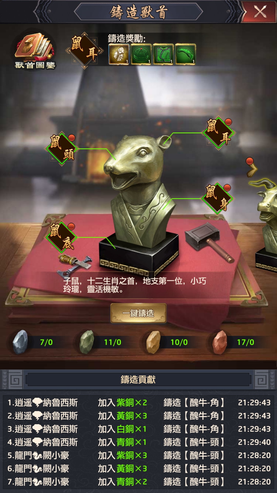 像是「鼠底」需要「白銅*2、青銅*2、黃銅*2、紫銅*2」,只要任一成員提供該材料,四個隊員都可以領取獎勵「體力丹(黃丹)*1、精力丹(粉丹)*1、活力丹(藍丹)*1」,並完成鼠底部份的鍛造,接著任何人都可以接續「鼠身」的鍛造。