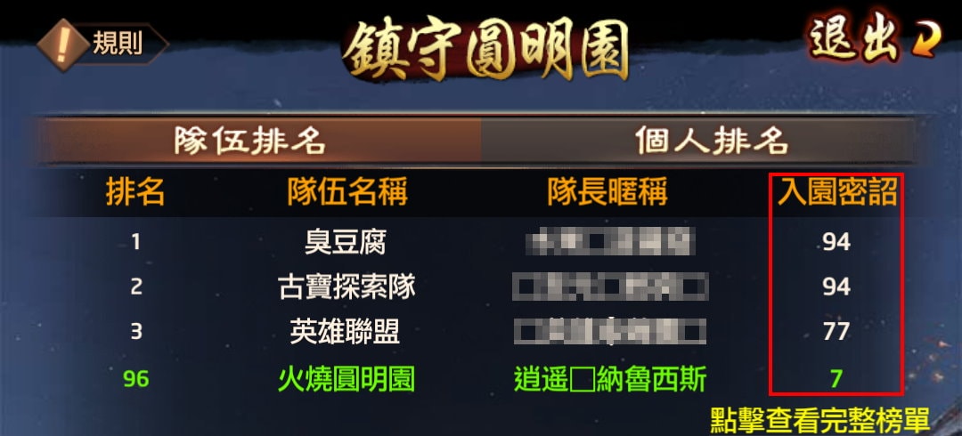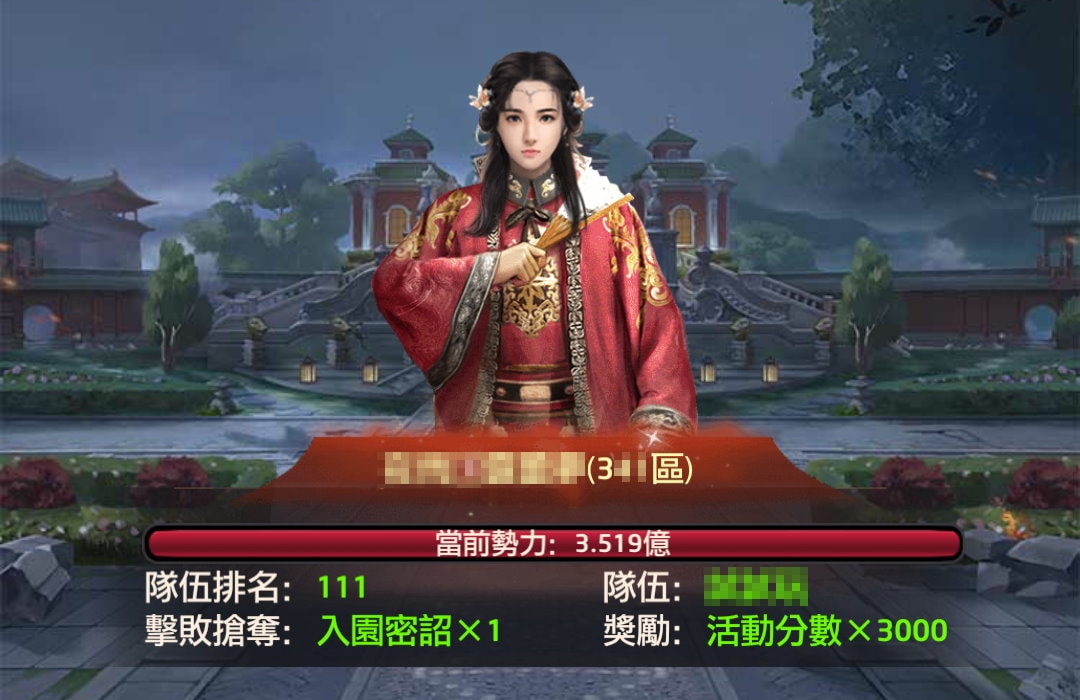 隊伍排名主要是依據隊伍擁有「入圍密詔」的數量,而入圍密詔的產生方式就是,當玩家從「萬春園」前進至「圓明園」時,就會獲得「2份」入圍密詔。若平均起來有500名玩家來回共入圓明園3次,那該次活動總共就會產生 500 * 3 * 2 = 3,000個入圍密詔。