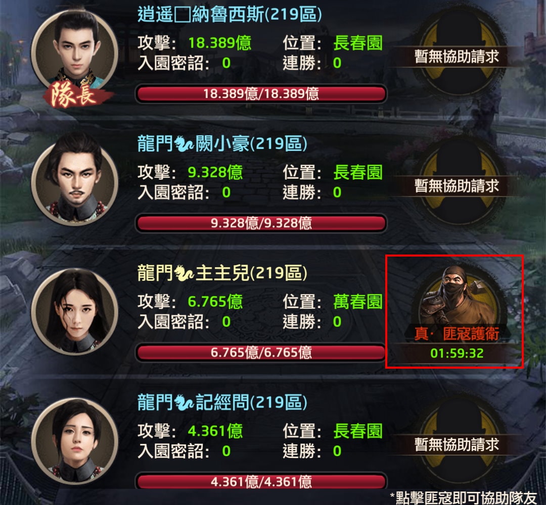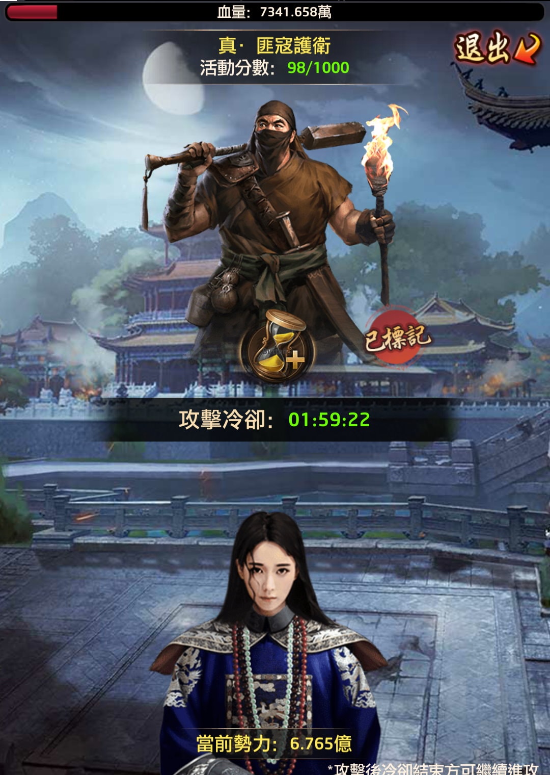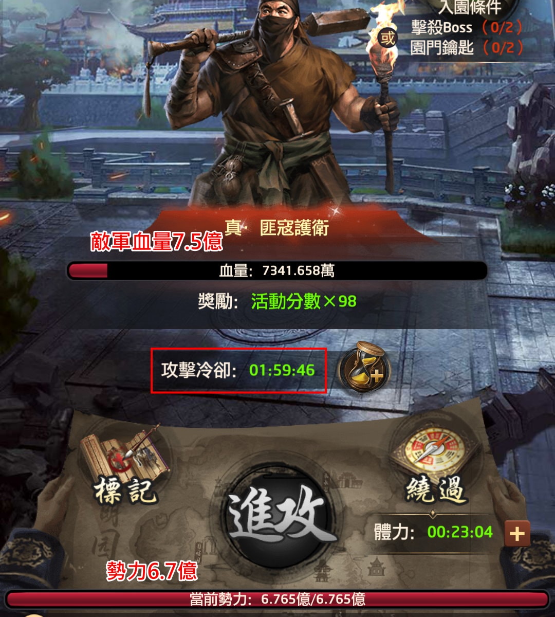 譬如玩家A攻擊力(6.5億)遇到護衛234號(血量7.5億),攻擊之後打不死(剩1億),標記他讓隊友(勢力1億以上的)來幫忙擊殺,擊殺之後玩家A再出去探索又遇到隊長123號,此時因為是不同對象,就完全沒有冷卻問題,是可以馬上進行攻擊的。