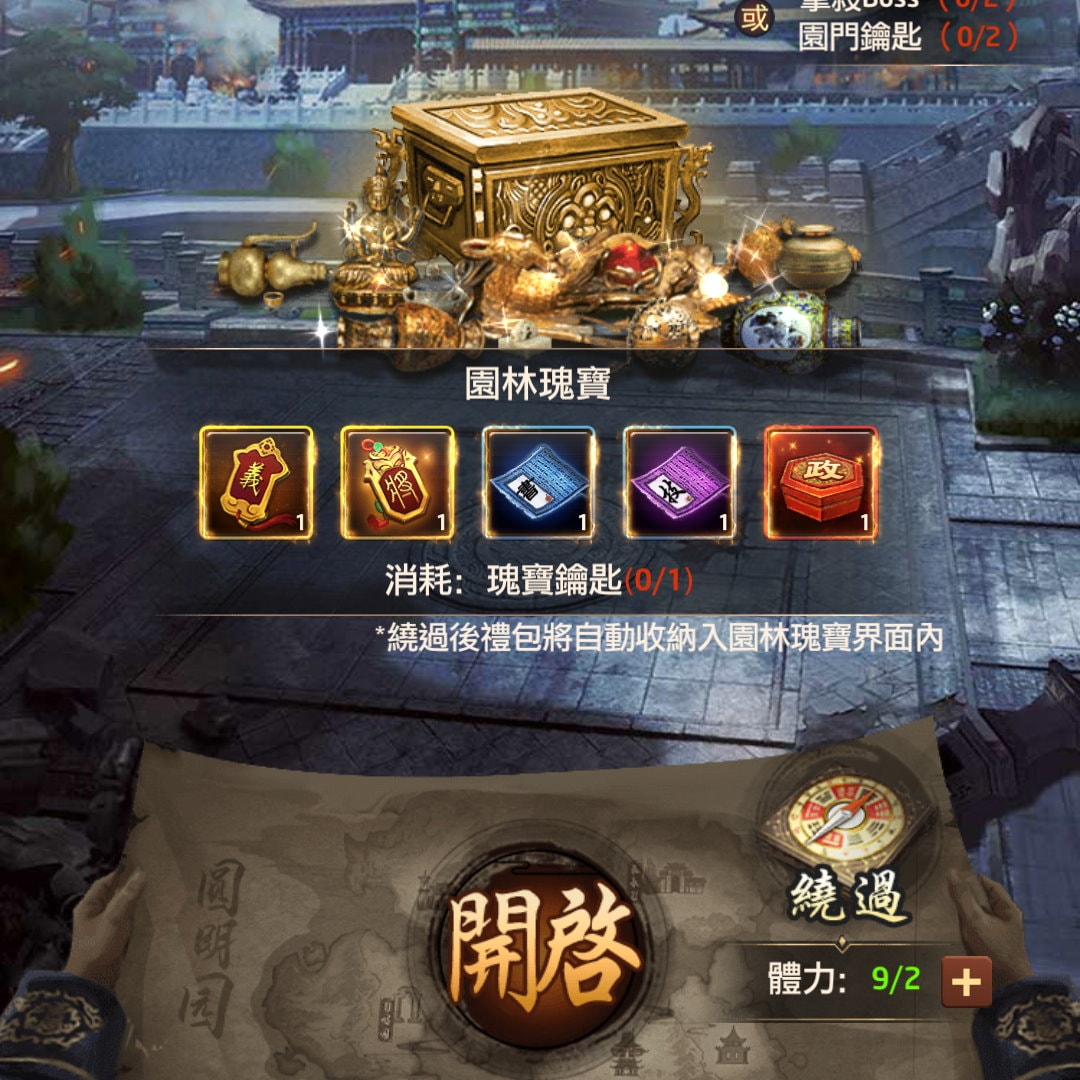 寶箱,有園林秘寶瑰寶(須使用秘寶鑰匙開啟)跟園林瑰寶(須使用瑰寶鑰匙開啟)兩種,若身上無鑰匙就點繞過,寶箱還會留在「園林瑰寶」界面中。