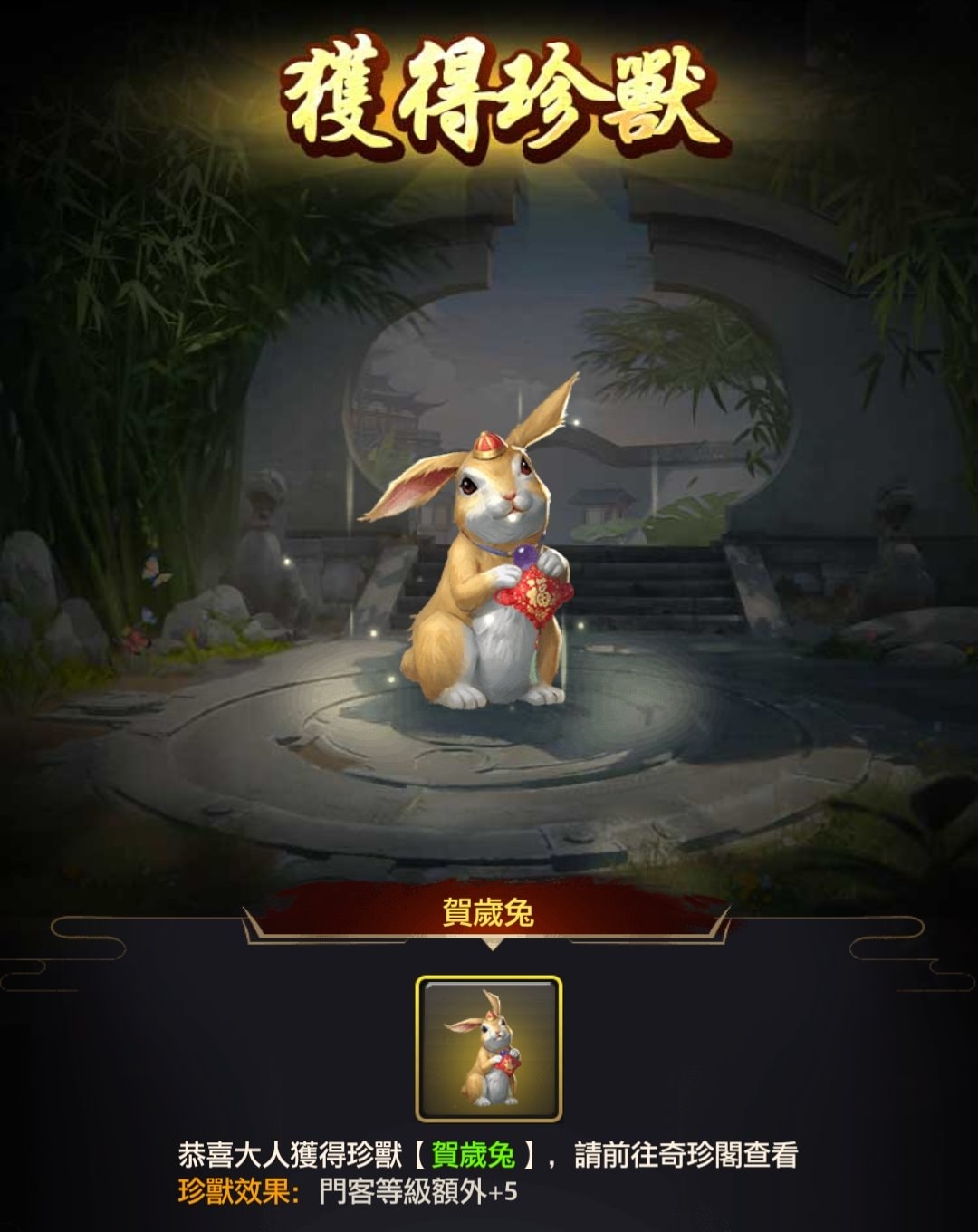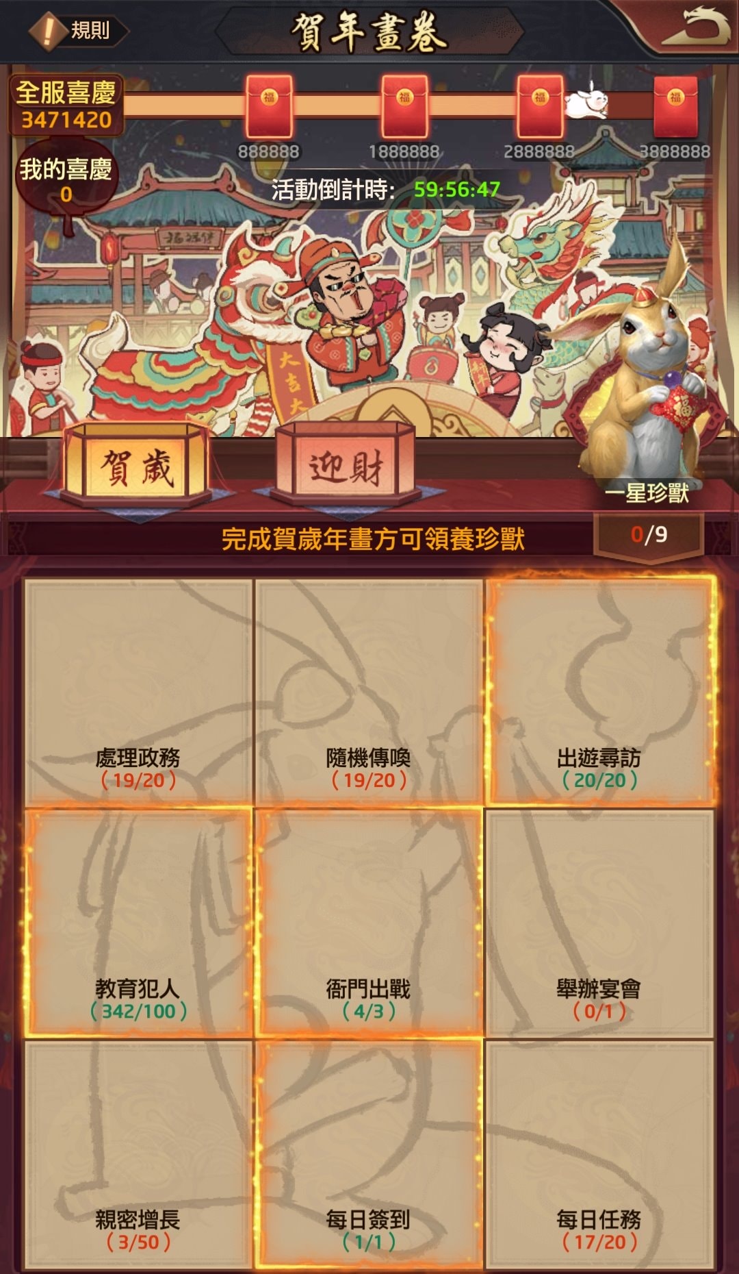完成「賀歲」九宮格則可領到珍獸:賀歲兔,並可繼續挑戰「迎財」九宮格。許多玩家都表示:總算知道為什麼珍獸掉落機率這麼低了…XD