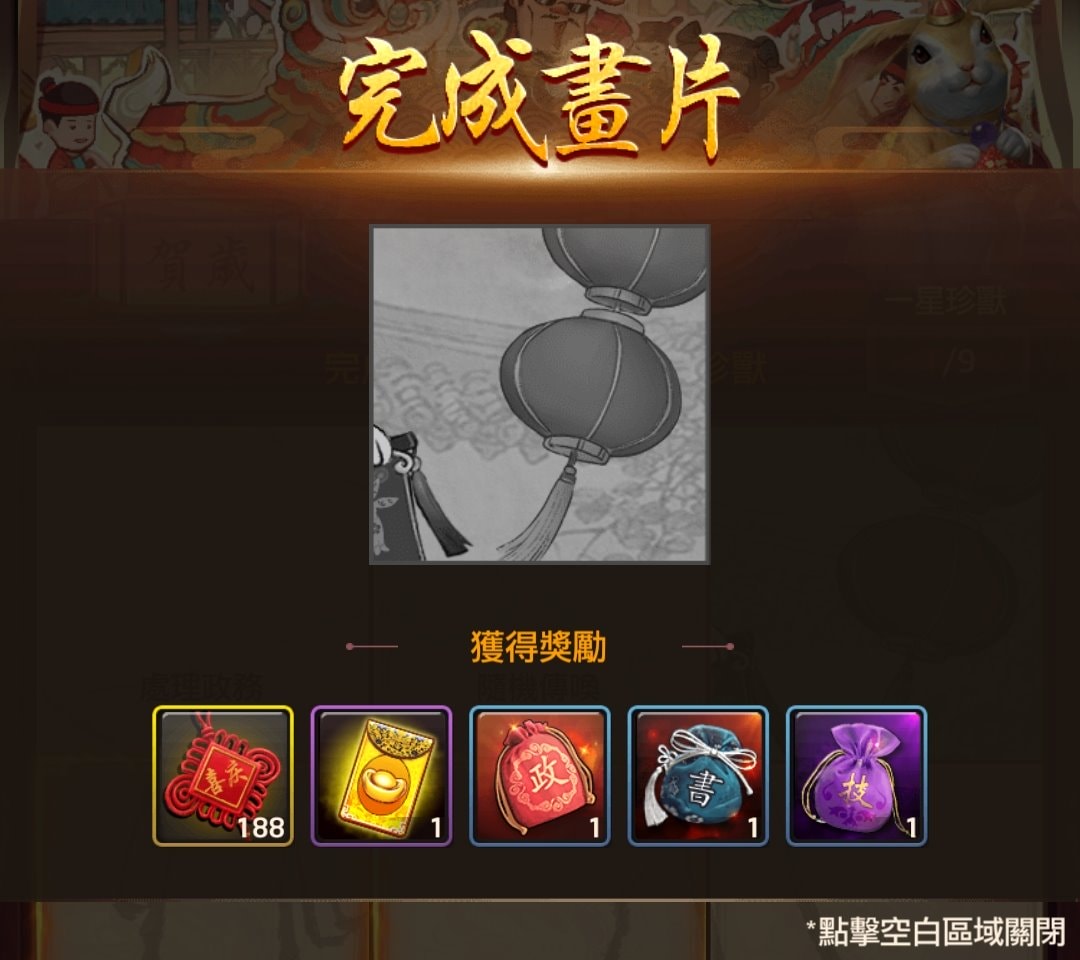 遊戲的基本形式就是完成活躍任務領取獎勵,只是在界面上有些變化,變成是九宮格,第一個九宮格是「賀歲」,完成後可獲得「珍獸」賀歲兔。