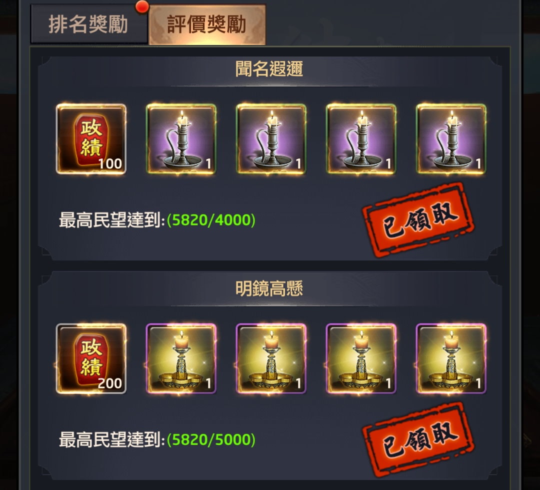 | 5,000 | 政績*200、明燈*4 | 明鏡高懸 |