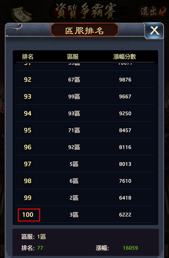 爭霸賽參加競賽的「區服」數量會越來越多,後面都是所有的區服一起競賽,要拿個人獎或區服獎都很競爭。